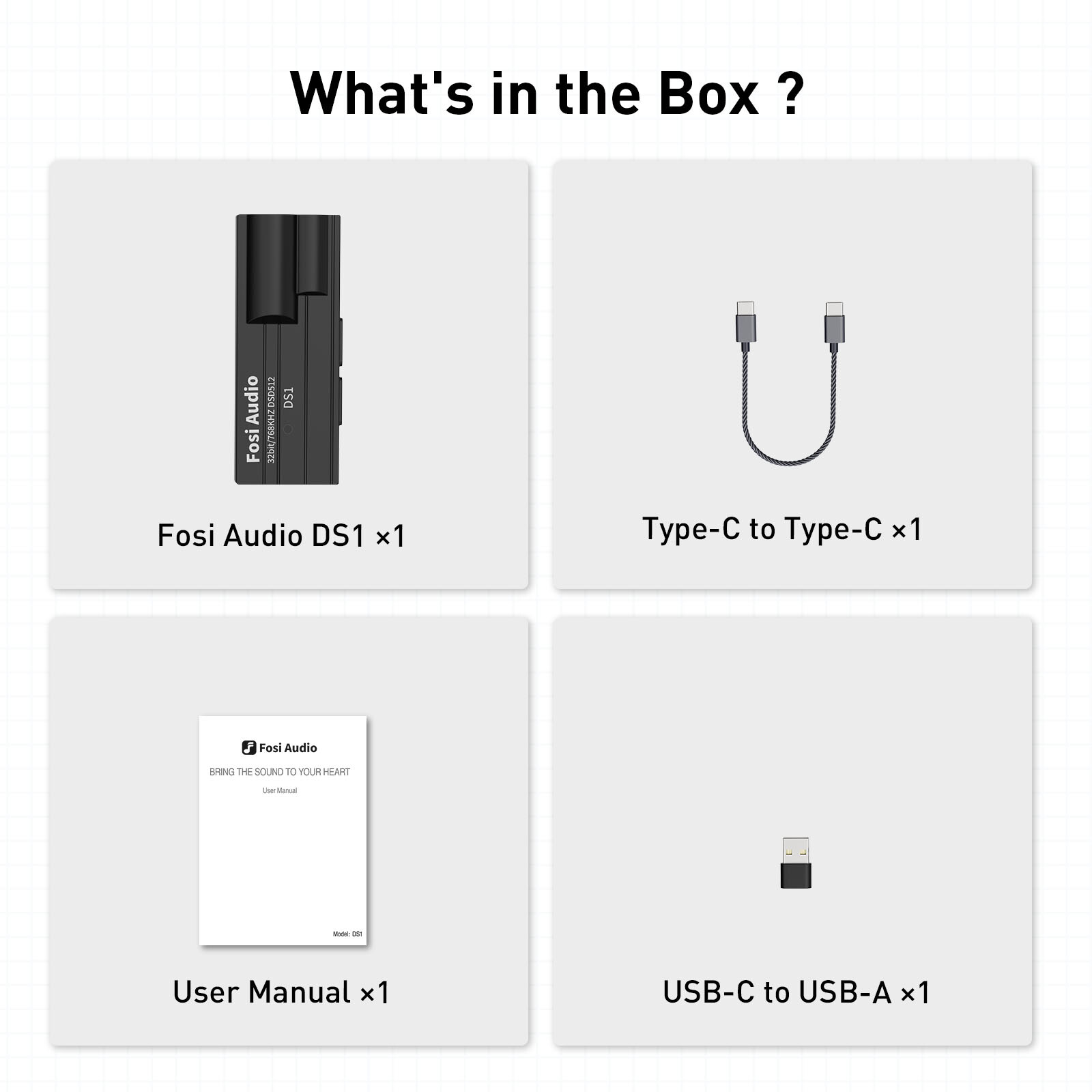 What You Get: DS1 USB DAC Headphone Amp x1, Type-C to Type-C cable x1, USB-A to USB-C Converter x1, user manual x1.