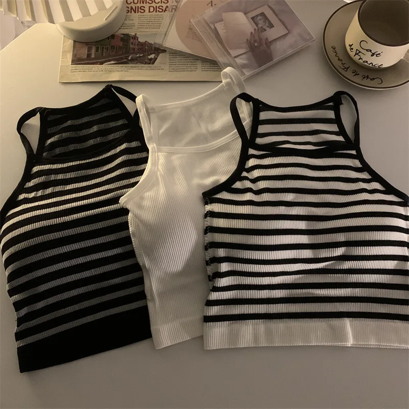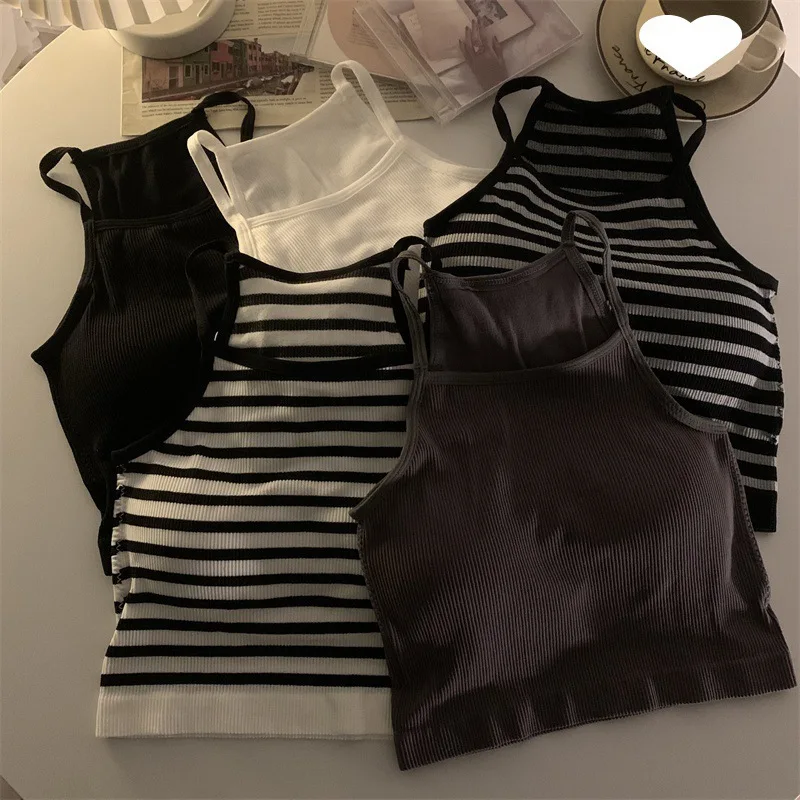 Korean Version Women Tank Tops Thread Solid Casual Fashion Crop Top with Chest Pad Stripe Sleeveless Outer Wear Basic Camisole
