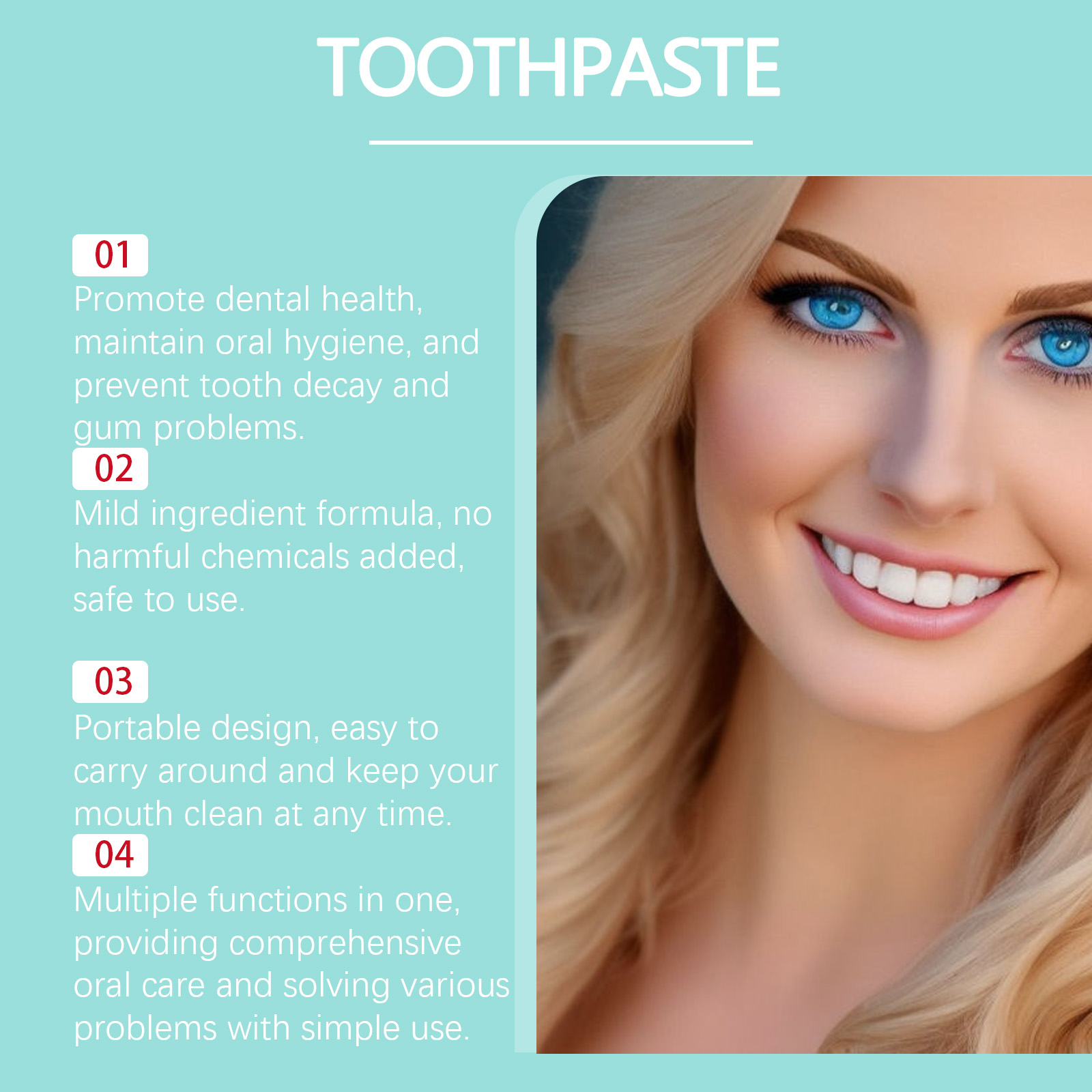 Our tooth care toothpaste contains sodium lauryl sulfate and hydroxypropyl methyl cellulose. It can provide comprehensive oral care, is simple to use, and solves various problems. Its use is very simple: take an appropriate amount of this product on the toothbrush, brush gently for 3 minutes with the correct brushing method, and rinse your mouth thoroughly with water. And can effectively remove yellow stains and stains on the surface of the teeth.