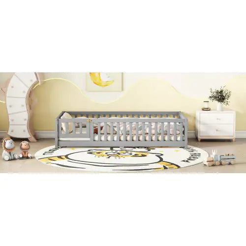 Twin Size Bed Floor Bed With Safety Guardrails And Door For Kids, Gray